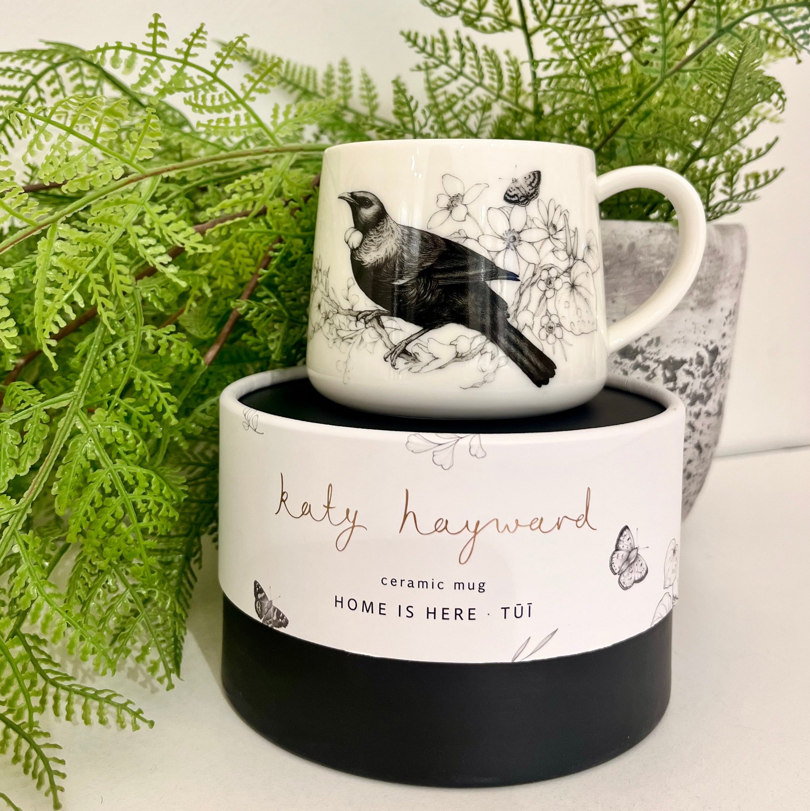 ‘Home is here’, featuring a tūī bird perched on a wave of Aotearoa/New Zealand native flora, including- puawananga/clematis, kawakawa, mānuka and kōwhai.