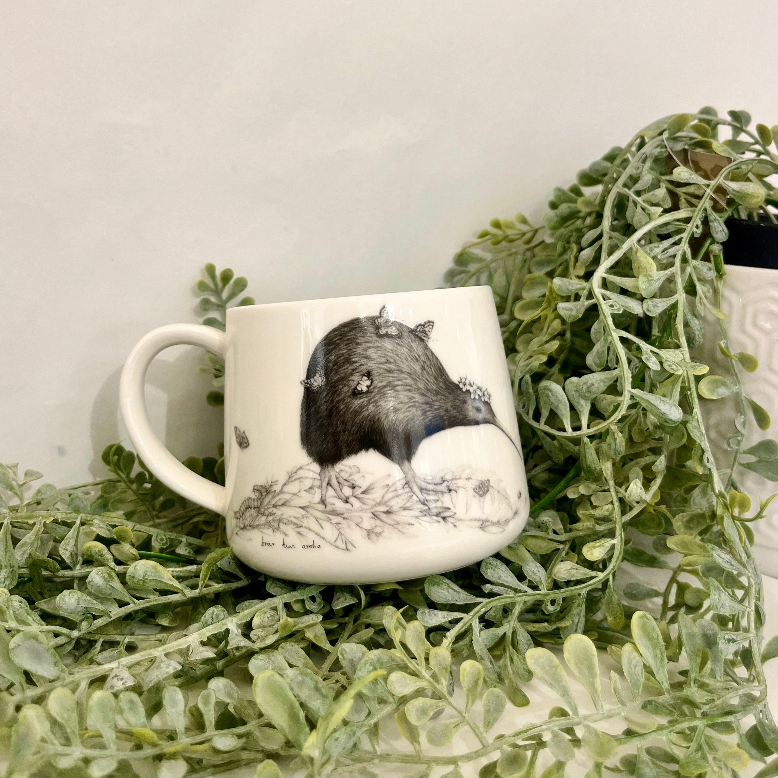 ‘Walking with aroha’, features a brown kiwi taking a stroll through beautiful Aotearoa / New Zealand native bush foliage. This kiwi is sporting a fancy mānuka flower crown and is joined by a few special native friends.