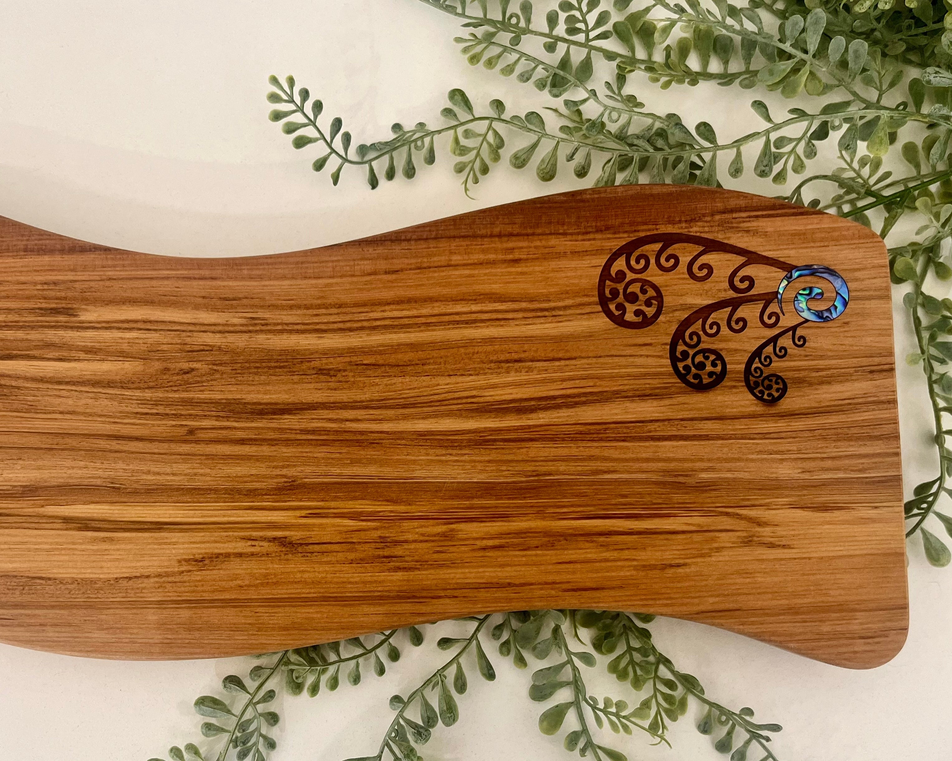 Engraved with a swirling spiral Fern pattern and inlaid with a paua koru.
