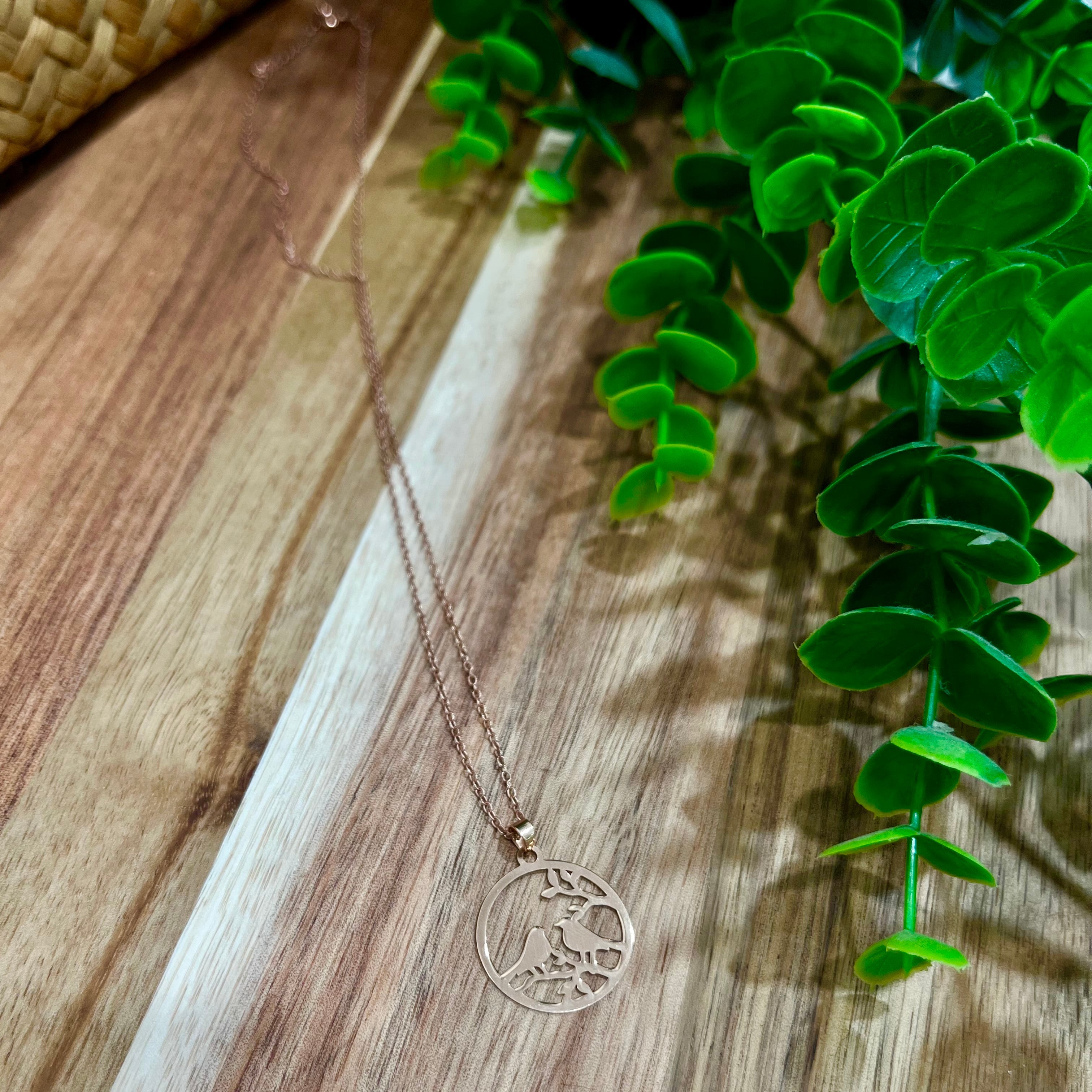Rose Gold necklace with a circular pendant featuring two birds in flight.